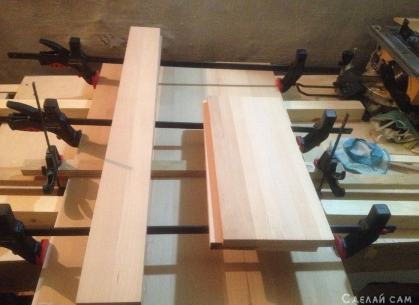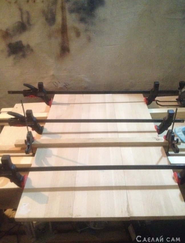 Клеим на спец клей для древесины. Зажимаем все, оставляем на сутки сохнуть. После чего вырезаем столешницу нужной нам формы. Из широких досок делаем заготовку на половину стола, для основы.