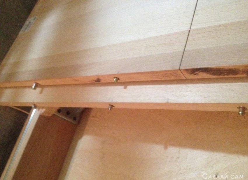 Создаем ровную поверхность, после чего под углом 90 градусов выставляем конструкцию. Устанавливаем перемычки (покупаются в магазинах для мебельной фурнитуры). По бокам, к основанию крепим пластины с роликами. Также, второй частью крепим их к столешнице. Что касается ножек - я использовал готовые, со старого стола, но при желании можно вырезать их самому.
