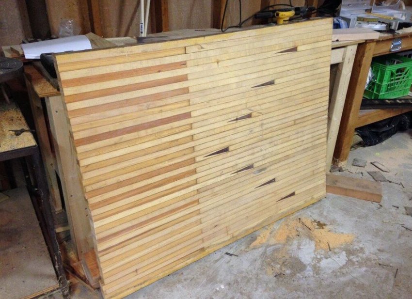 Сперва, сделал заготовку, все проклеил, но к сожалению, без использования спец зажимок. Как результат, конструкция развалилась при небольших нагрузках по переноске. Обрезал доски по ходу, до того, как закрепить их. Таким образом, все получилось максимально ровным, без переходов.