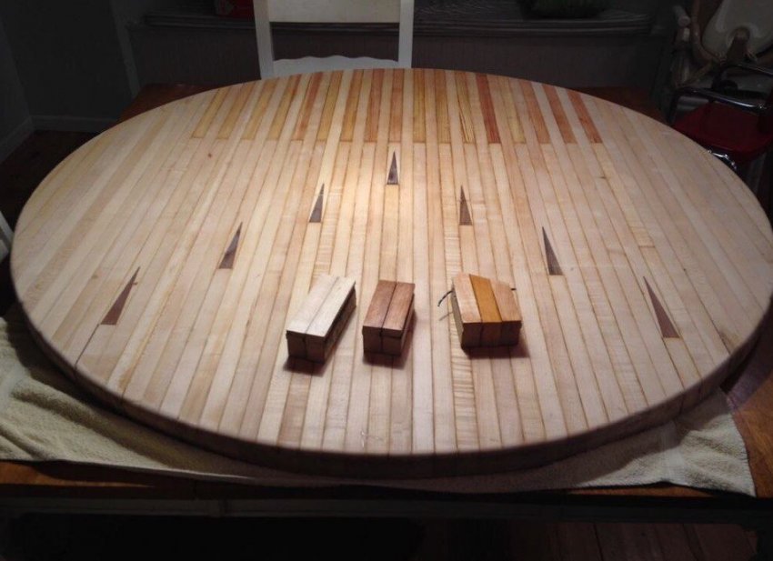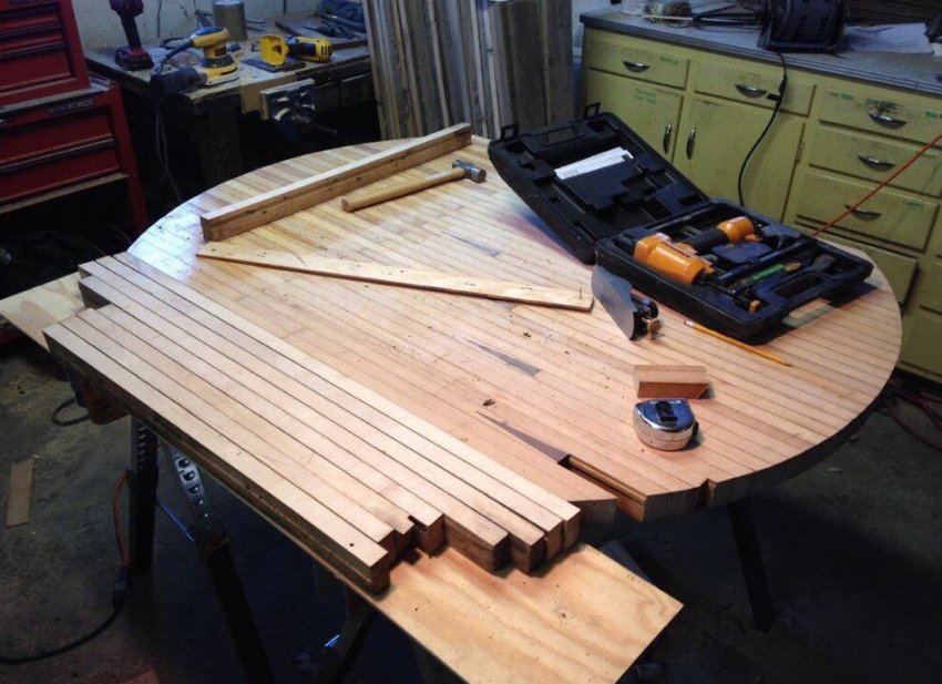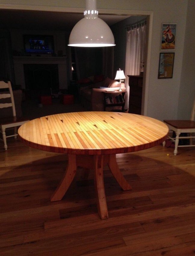 На даче у нас валялся старый круглый стол. Верхняя часть его была уже ни для чего не годна, лакированное покрытие потрескалось, появилось много трещин и т.д. Но, насмотревшись ранее статей про модульные плиты/столешницы/барные стойки сделанные из склеенных реек, начались чесаться руки. В магазине купил специальный клей для дерева. Все остальное было дома.
