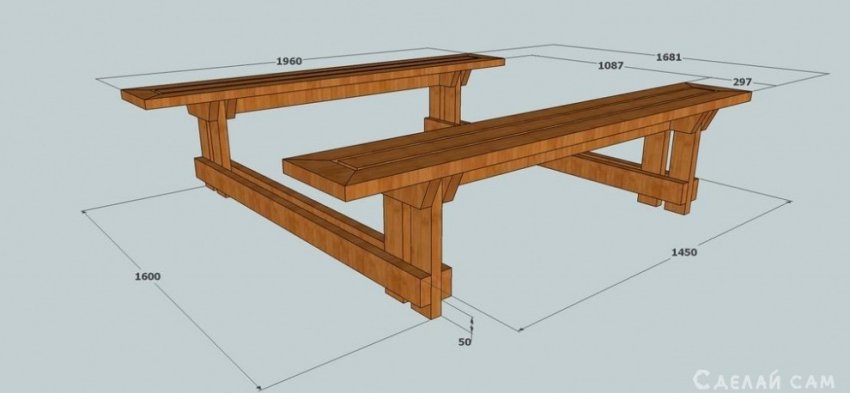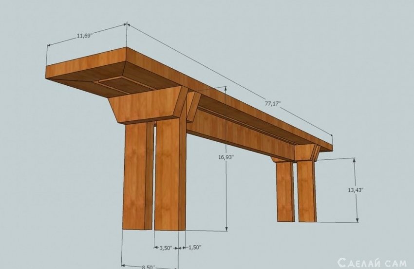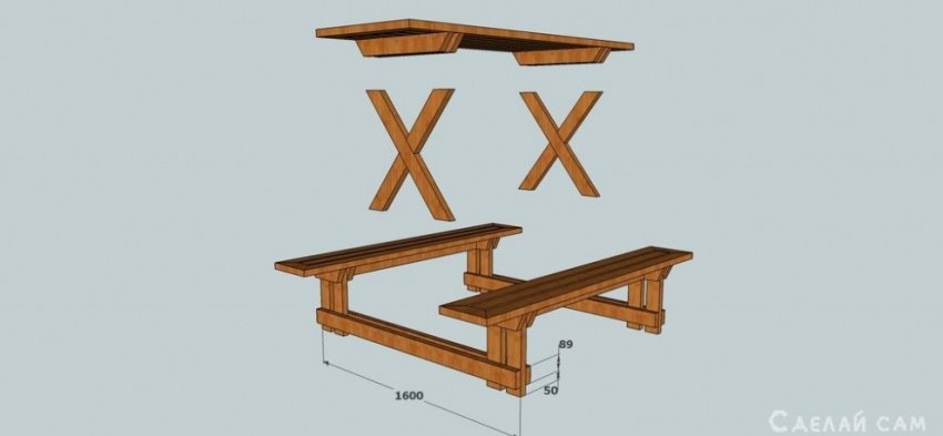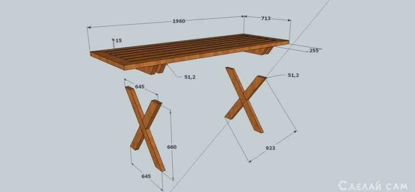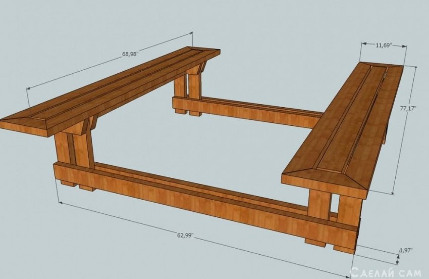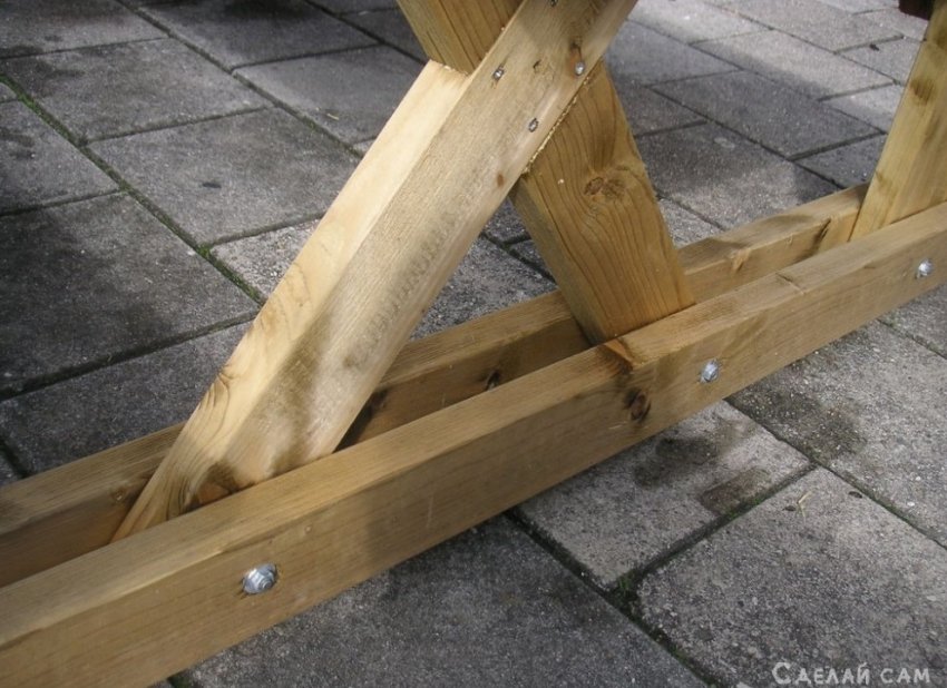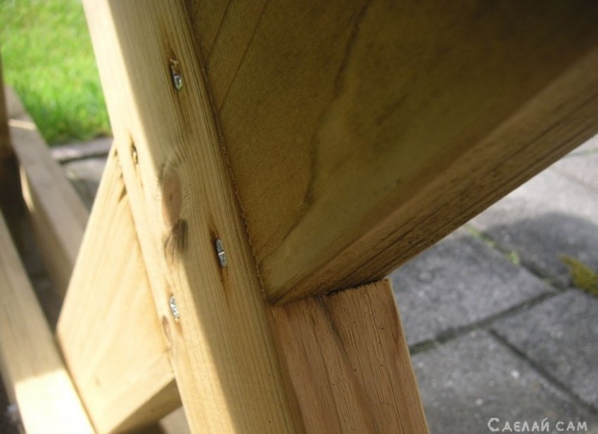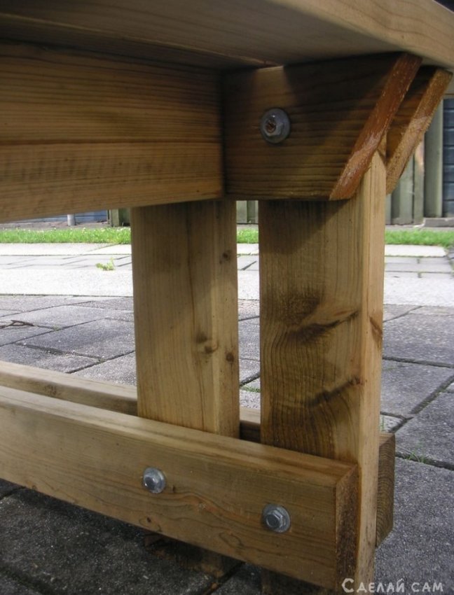 Лавки крепятся с помощью тех же винтов. Ножки лавки изготовляются из более толстых балок.
