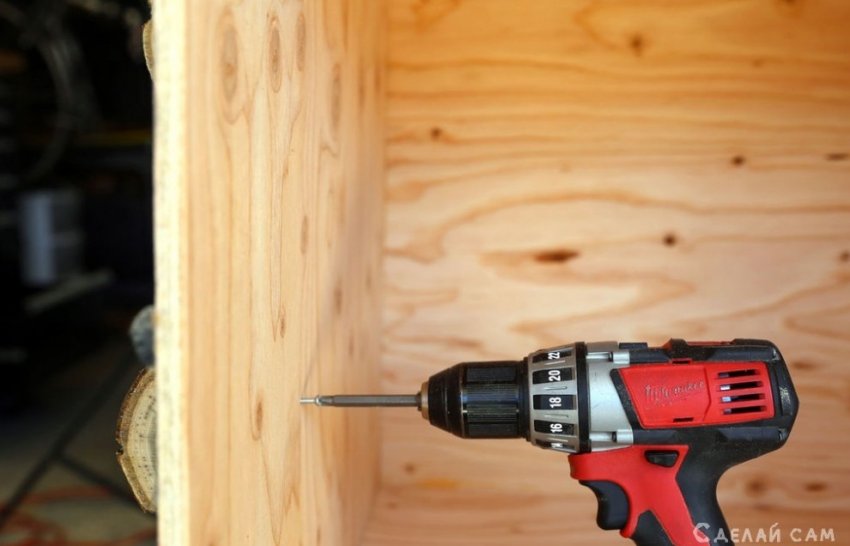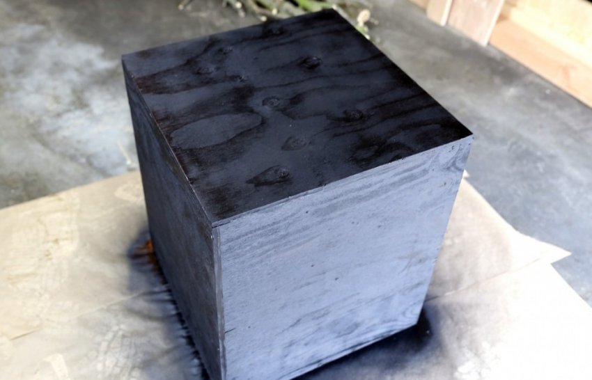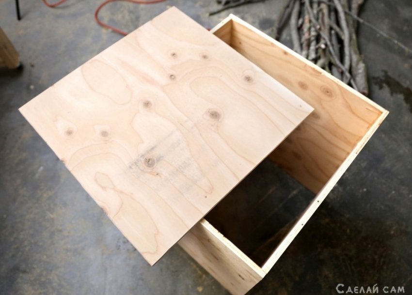 В щели засыпаем мелкие опилки, чтоб основа (ящик) не бросался в глаза. Обрабатываем поверхность лаком.