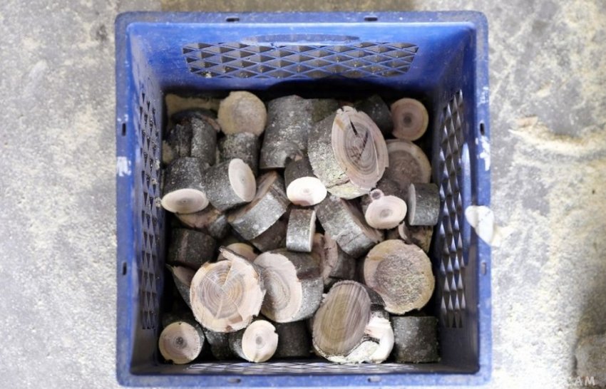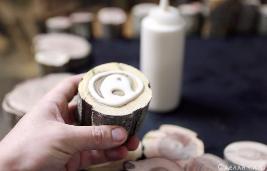 Несколько поленьев нарезаем кружочками. Будем обклеивать верхнюю часть ящика.