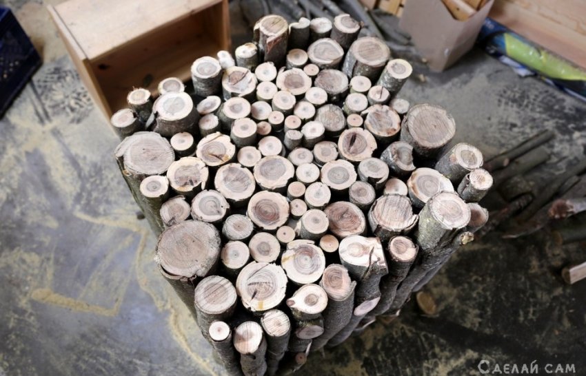 В качестве основы, было сделано специальный фанерный ящик. Идея проста, обклеить фанерный ящик поленьями таким образом, что бы создавалось впечатление цельного снопа. Фанеру использовали толстую.