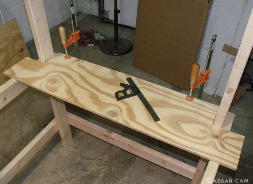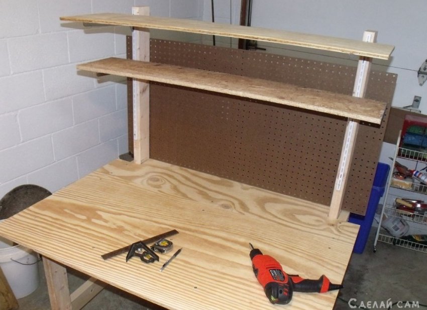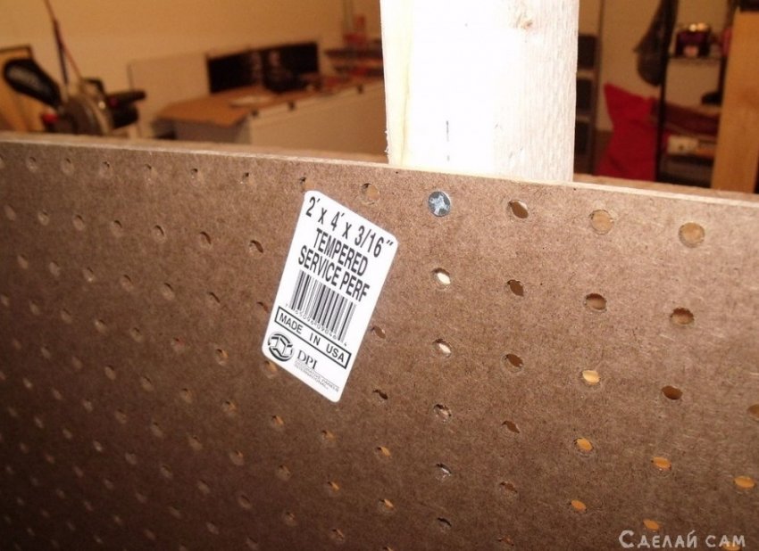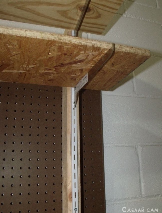 Добавляем полки. На верхнюю часть задних ножек, прикручиваем специальный полочный профиль. Прикручиваем стенку из перфорированный фанеры.
