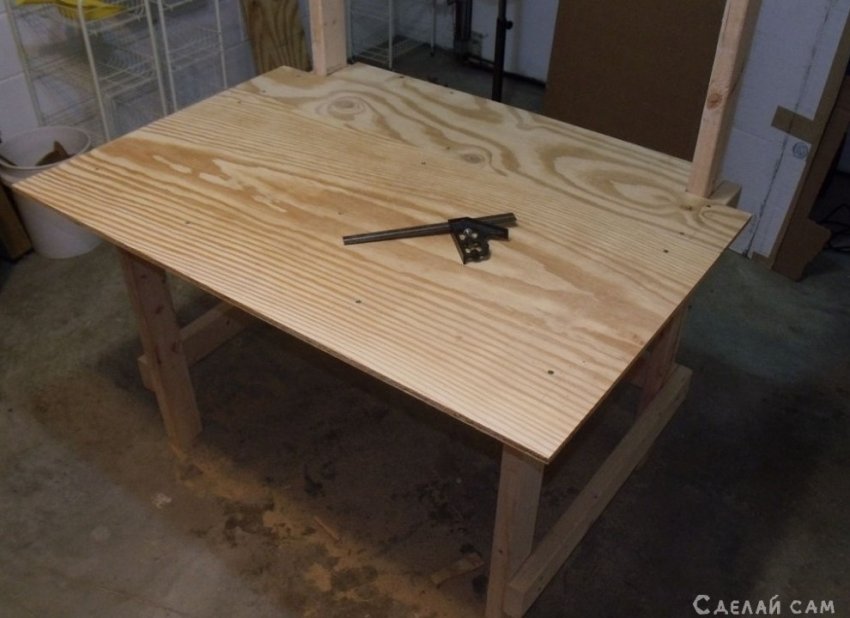 Подгоняем поверхность столешницы под размеры стола с помощью пилы. Столешница будет у нас из толстой фанеры.