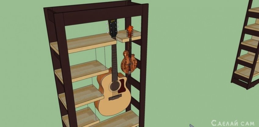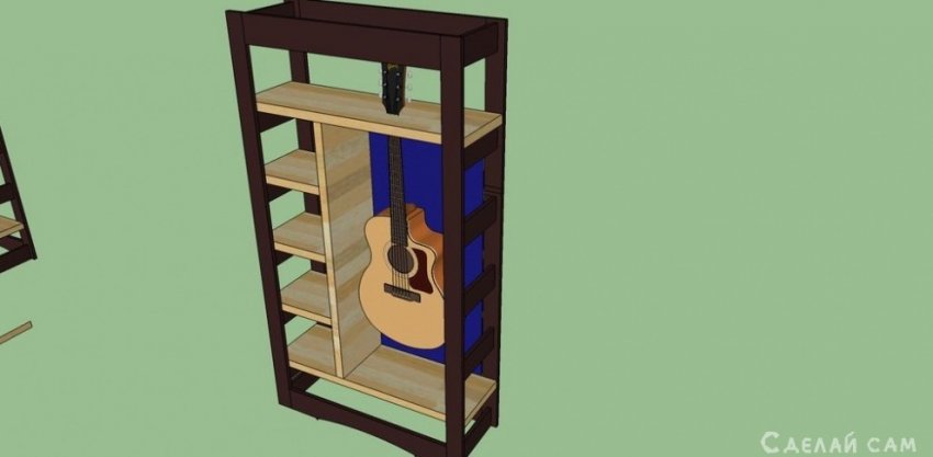 Первоначально, планировалась простенький книжный шкаф с держателями для гитары. Но по мере моделирования конструкции появлялись все новые и новые детали. И вот что из этого получилось.