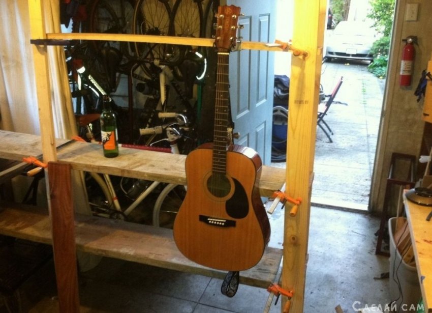 Вырез для гитары (края деревянной полки) оббиваем тканью, дабы не наносить урон гитаре в процессе эксплуатации.