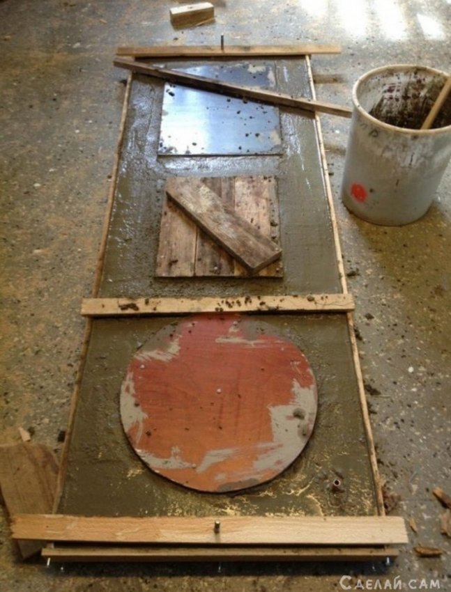 Что касается столешницы, то делали мы ее из бетона. Сделали своего рода "основу" из сетки. Из дерева вырезали круглую форму, для раковины.