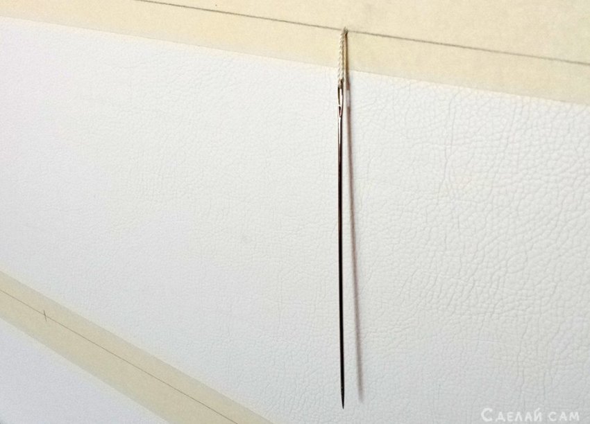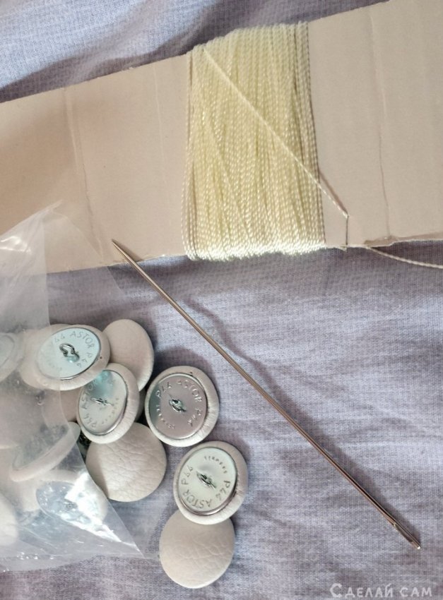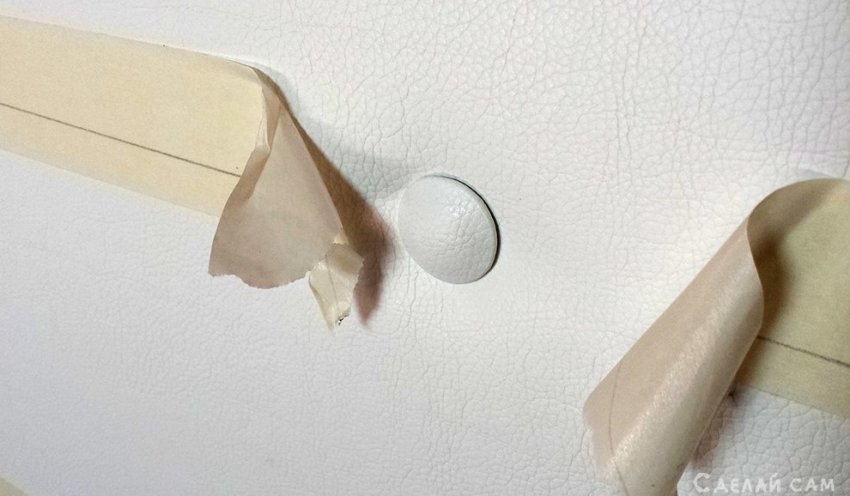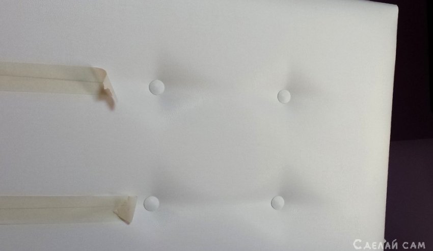 В ДСП сверлим дырки, размечаем с лицевой стороны при помощи малярного скотча и карандаша места крепления пуговиц