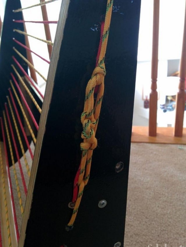 На этом этапе вам может понадобиться помощь кого-то из друзей, кто может вязать узлы, если вы этого делать не умеете. Попытки получить как можно большее натяжение шнура путем шнурования с того или иного края шнура, показали, что лучше всего начинать шнурование с середины участка. Участки шнура по 50 метров, способны одновременно и облегчить, и усложнить задачу. Облегчение состоит в том, что натягивать придется не 100, а всего лишь 50 метров шнура, что позволит потратить меньше усилий и сделать передышку. А затруднение – в том, что так получается две зоны натяжения, и необходимы дополнительные корректировки чтобы два шнура получили похожую упругость. Свободные концы шнура лучше связать узлом внахлест.
