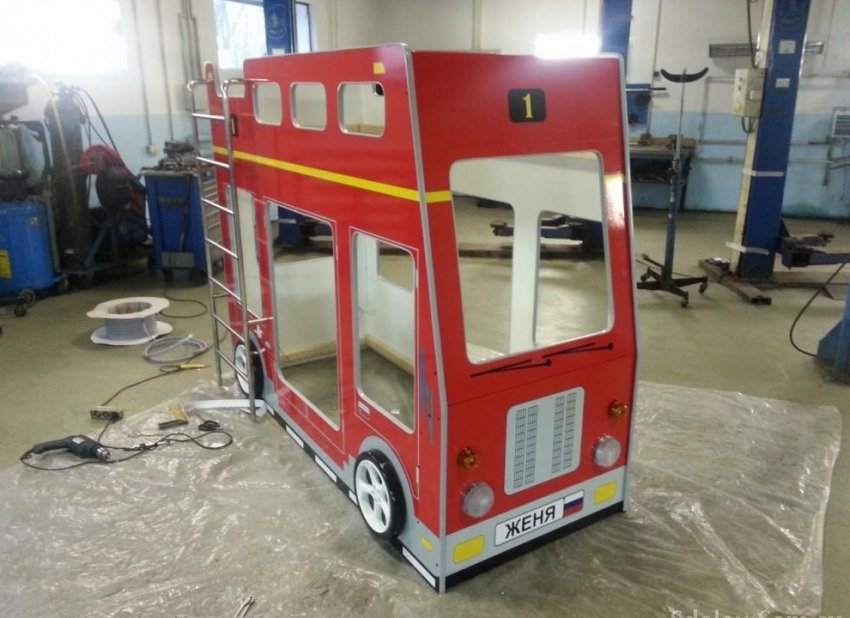 Решили приобрести кровать-машину своему ребенку. Почему машину, вы, наверное, догадаетесь сами, так как мальчику два года. Объездив и просмотрев все те кровати, которые предлагают производители мебели для детей, мы выбрали именно автобус, потому что в нем два яруса и ребенку понравилось.