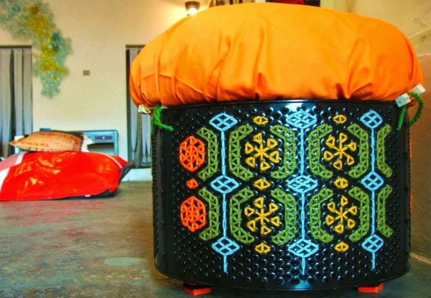 Один из последних эко-проектов компании - красивые пуфы с этническими мотивами, которые они называли Knit Knack. Эти веселые пуфики с вышивкой и яркими разноцветными подушками-сидениями в прошлой жизни были барабанами от стиральных машин-автоматов.) Как вам идея?