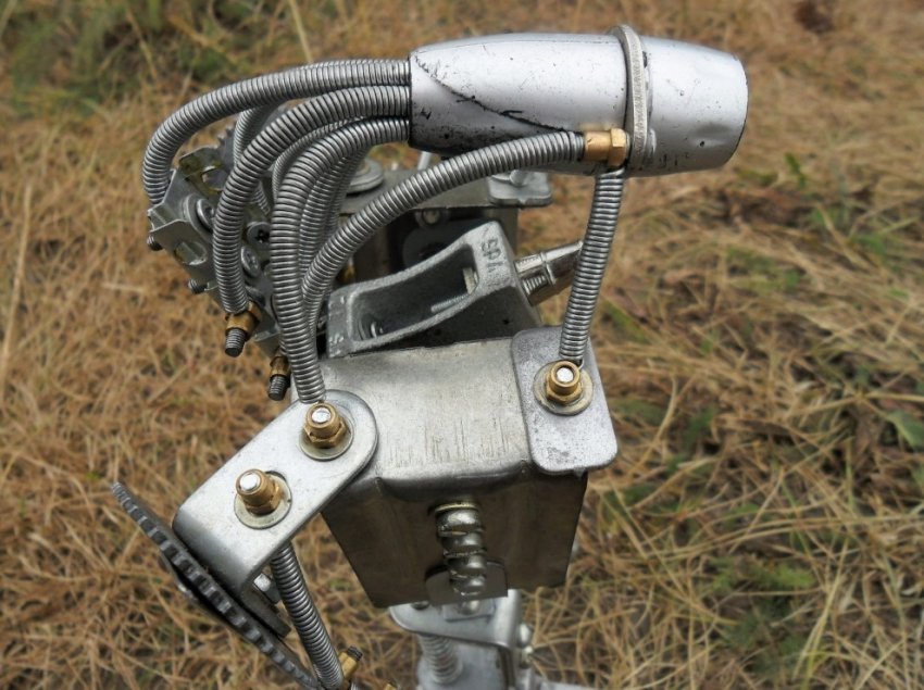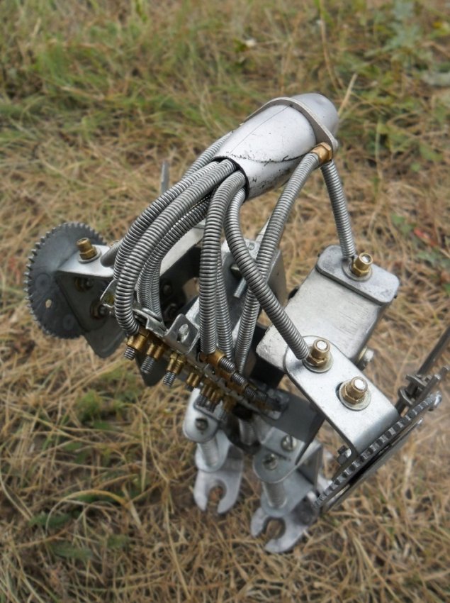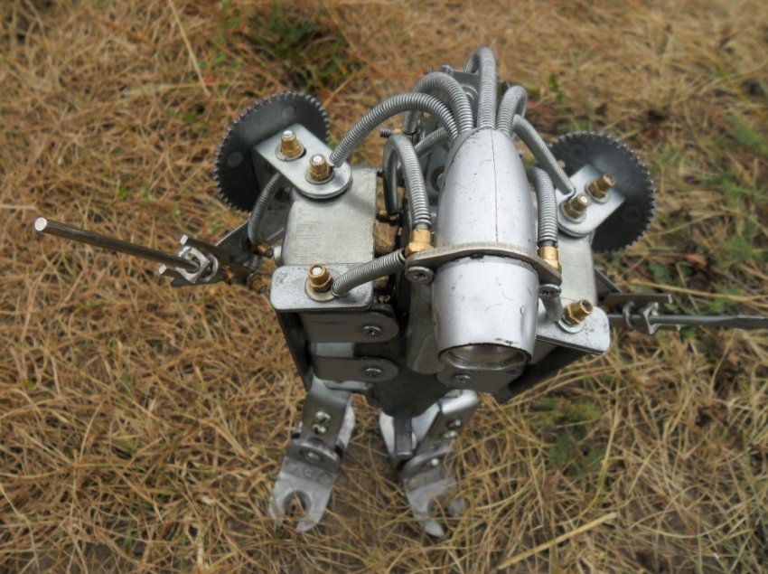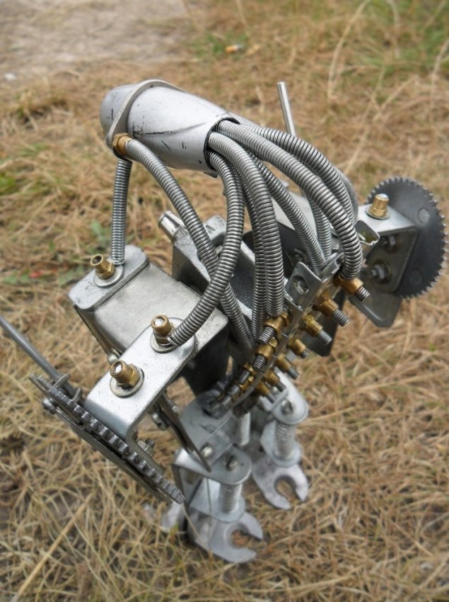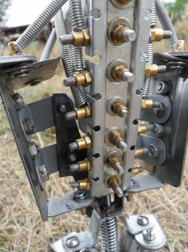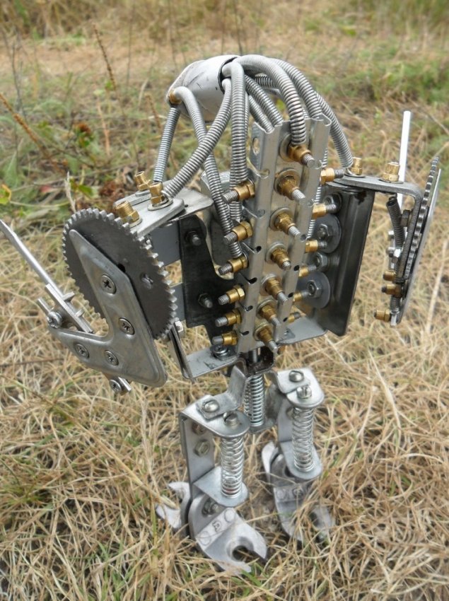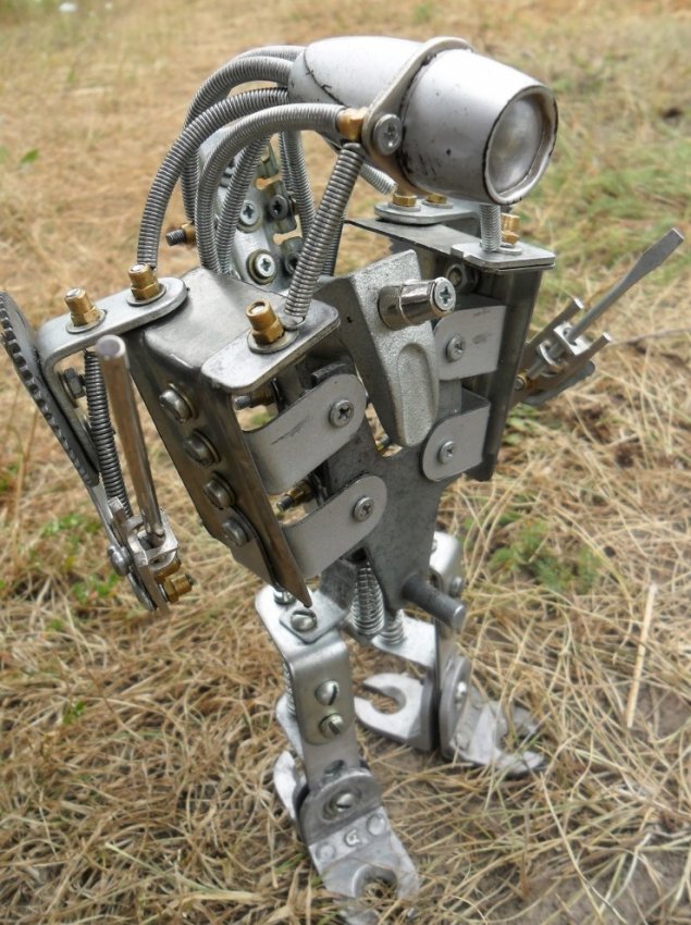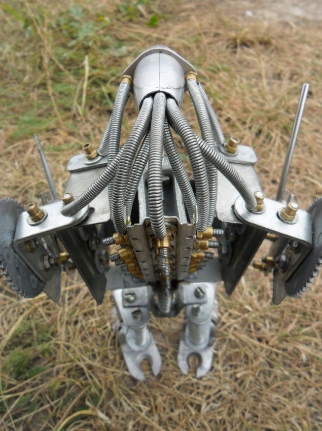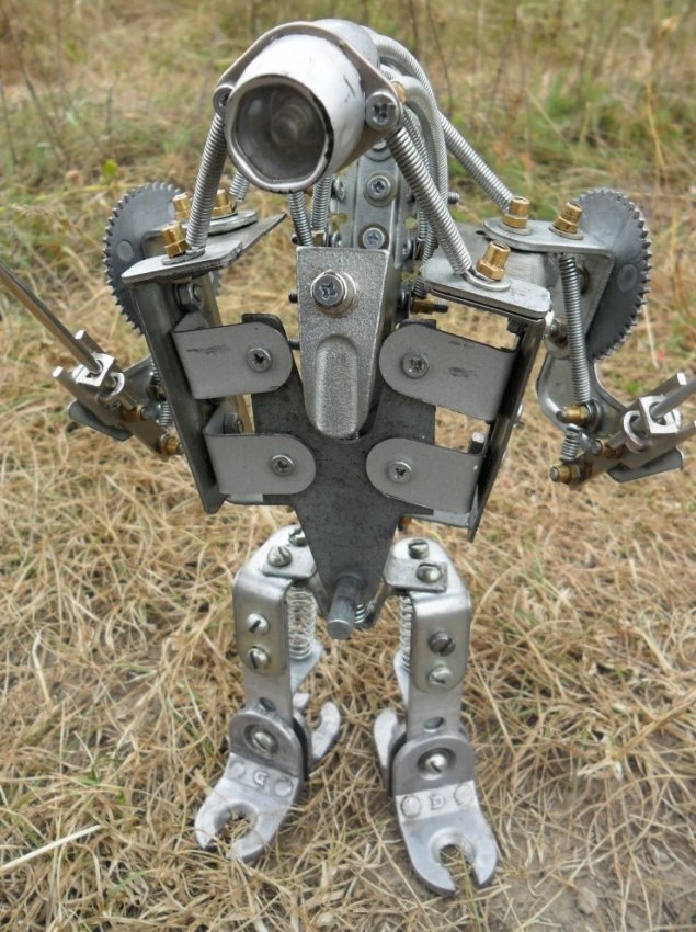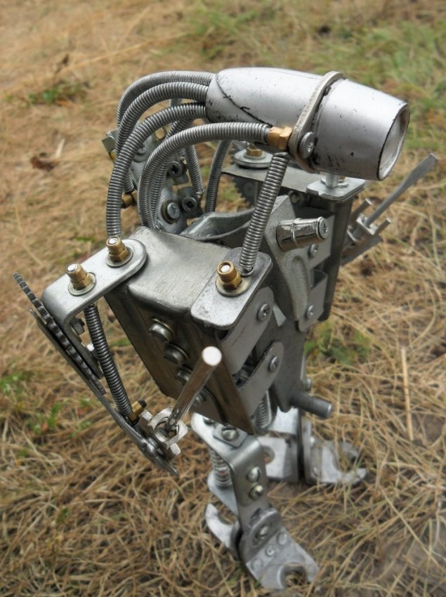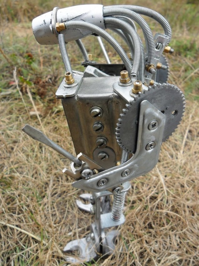 На нашу планету прибыл ещё один робот. Он не совсем антропоморфный, эволюция. Один из главных принципов работы это соединение деталей болтиками. Никаких спаек, склеек, гвоздиков и пластелина. Его можно разобрать и собрать, как конструктор, но это не так просто. Этот пока последний готовый экземпляр. Четыре робота ожидают очистки и модернизации. Эту его голову нашел на дороге. Хребет и боковые основы сняты с механизма для выдвижения шухлядки. Запястья из старого счётчика. Многое нашел у друзей в гаражах, ну и некоторые соединения покупал на рынке. Да что рассказывать, смотрите...