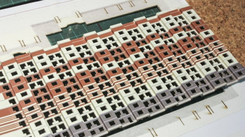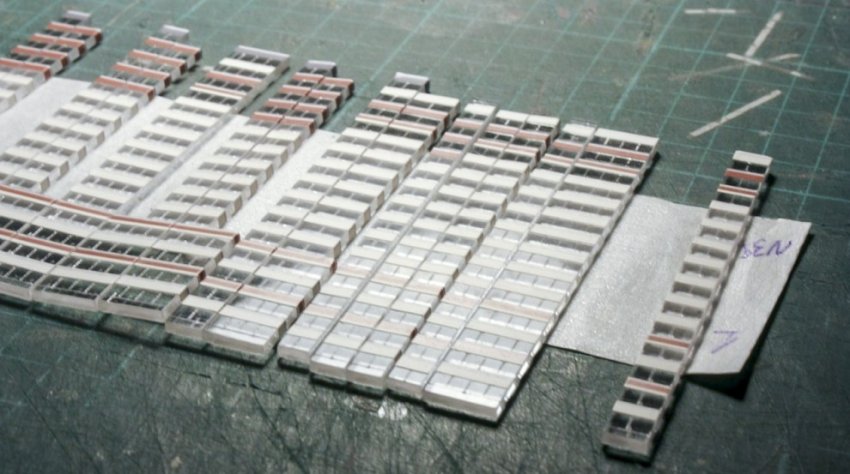 У этого макета очень маленький масштаб, 1:500, поэтому по классической технологии лоджии не изготовить. В этом случае мы вырезаем их из оргстекла толщиной 2 мм. Оконные рамы обозначаем гравировкой, а непрозрачные части - наклеенными цветными самоклеющимися пленками.