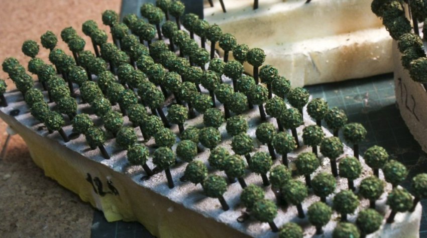 Деревья изготавливаем из бусин различного размера. В бусинку вставляем зубочистку и сверху присыпаем специальной присыпкой - листвой для деревьев.