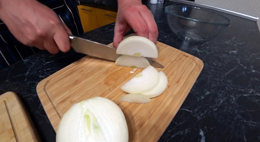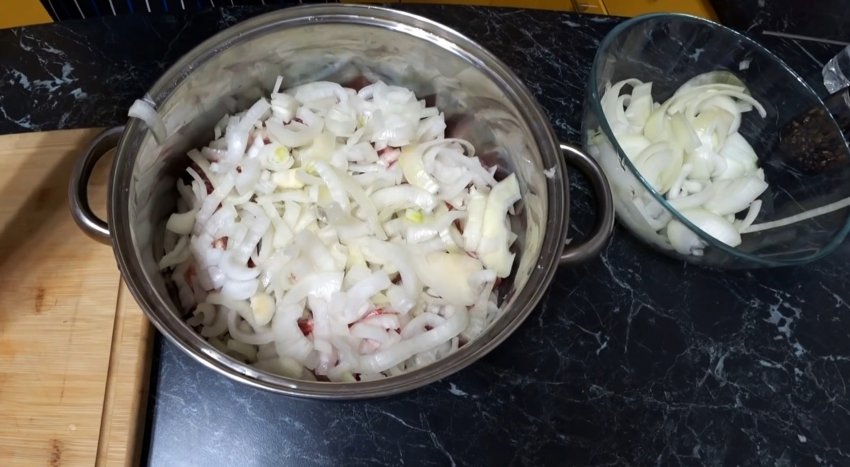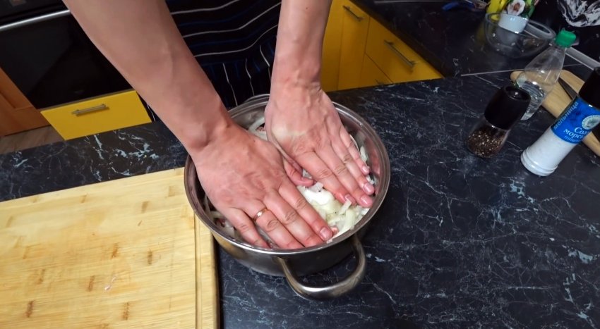 Лук нашинкуйте полукольцами и разомните руками, чтобы он дал сок. Переложите в глубокую емкость, посолите, поперчите и сбрызните уксусом.