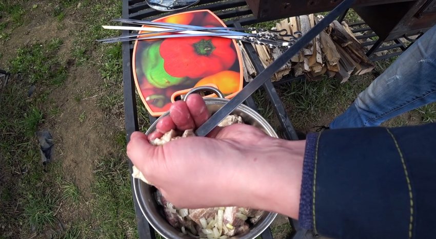 Перед приготовлением на костре перемешайте и при необходимости немного подсолите. На шампуры насаживайте только мясо.