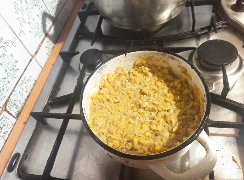 Горох впитает воду и станет мягче, что сократит время варки. Объем гороха увеличивается при замачивании почти втрое. Часть гороха нужно оставить не сваренной. Такой горох используется в качестве крупной фракции.