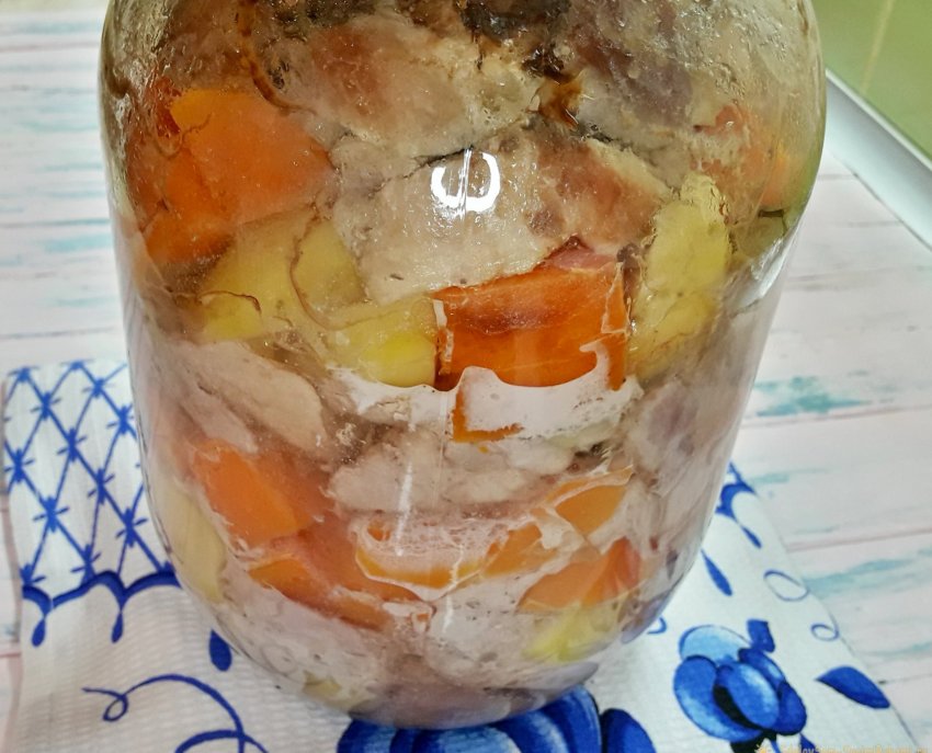13. Сквозь стекло видно, что половина банки заполнена соком, а мясо внизу хорошо разомлело.