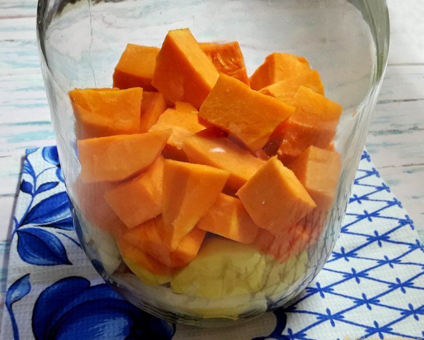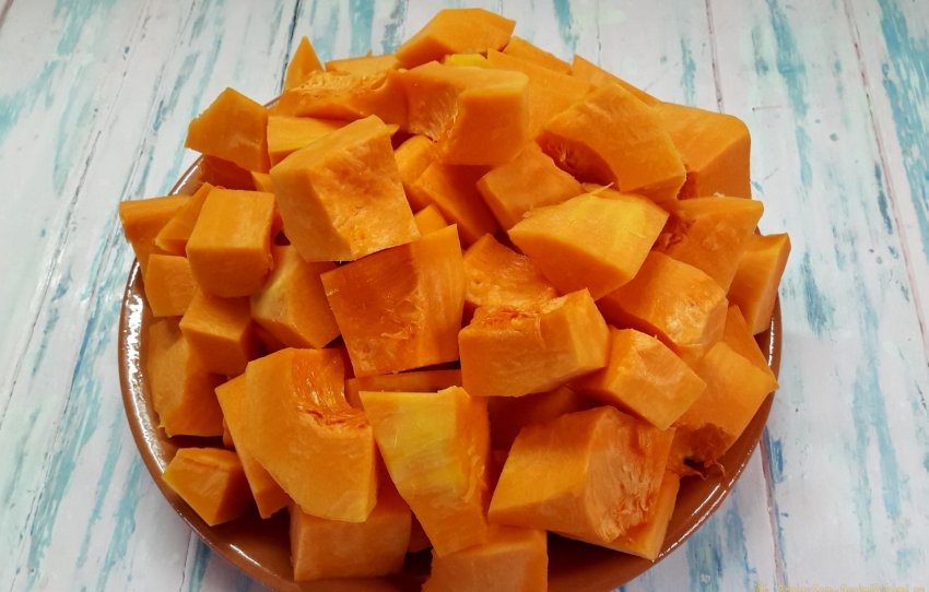 3. Кусочками, похожими на мясные, нарезать тыкву.