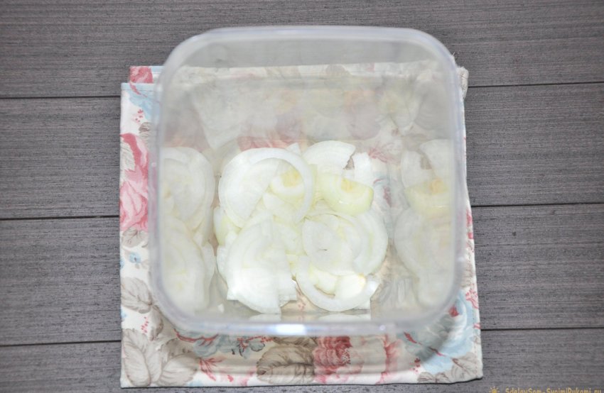 2. Луковицу средней величины очистите, сполосните под водой и нарежьте тонкими полукольцам/перьями. Далее уложите ее равномерным слоем на дно емкости, в которой будет засаливаться скумбрия (это может быть пластиковый контейнер, стеклянная банка или судочек).