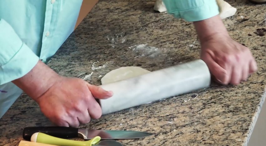 После подготовки начинки можно ставить нагреваться масло для жарки. Пока оно греется, тесто разделяется порционно и раскатывается в тонкий блинчик.