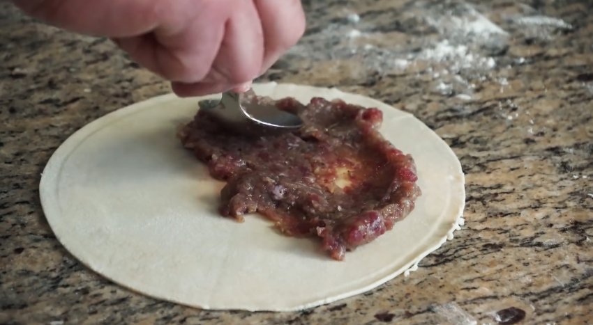 Затем фарш накрывается второй половинкой теста, и края чебурека скрепляются.