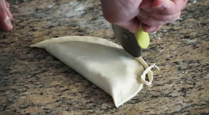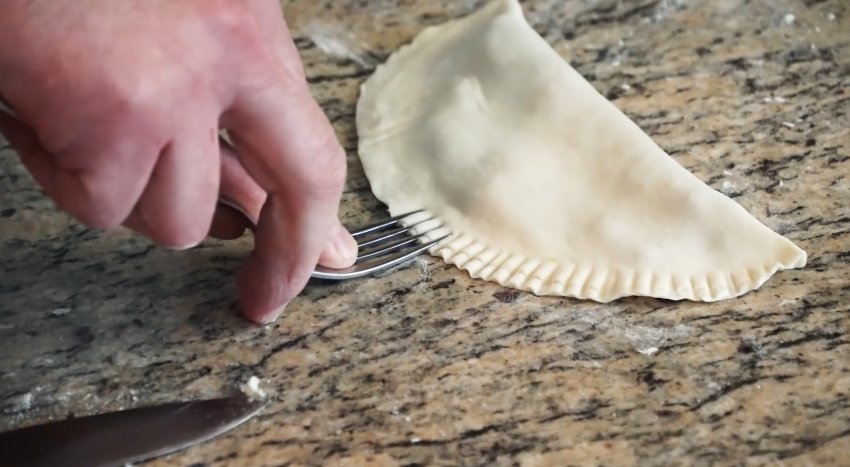 Сжимать тесто можно пальцами, прикатывать ножом для пиццы, или же вдавливать вилкой. В последнем случае окантовка выглядит эстетически привлекательно.
