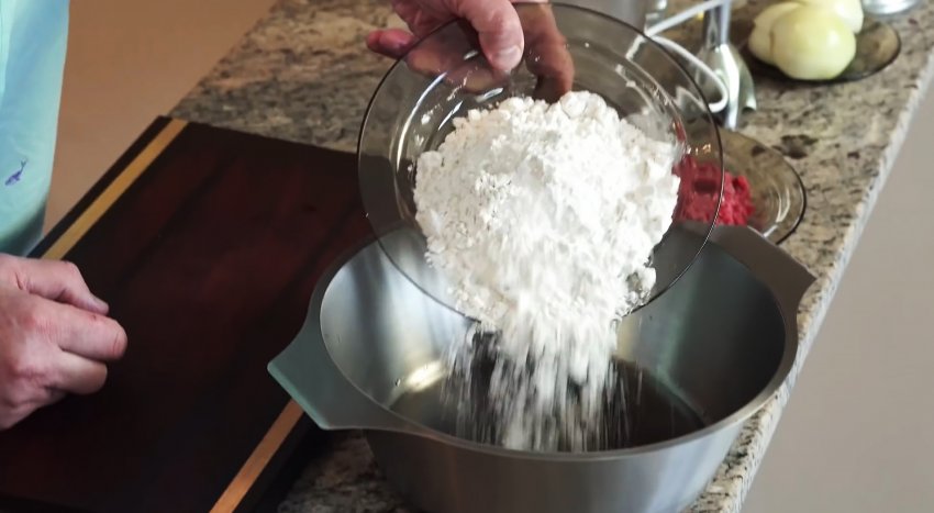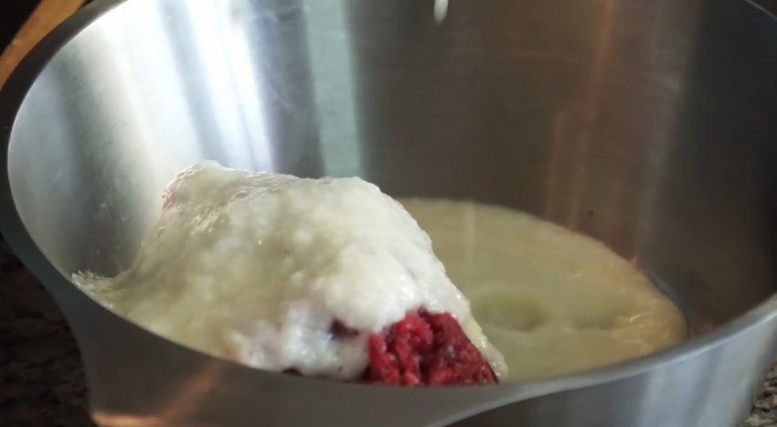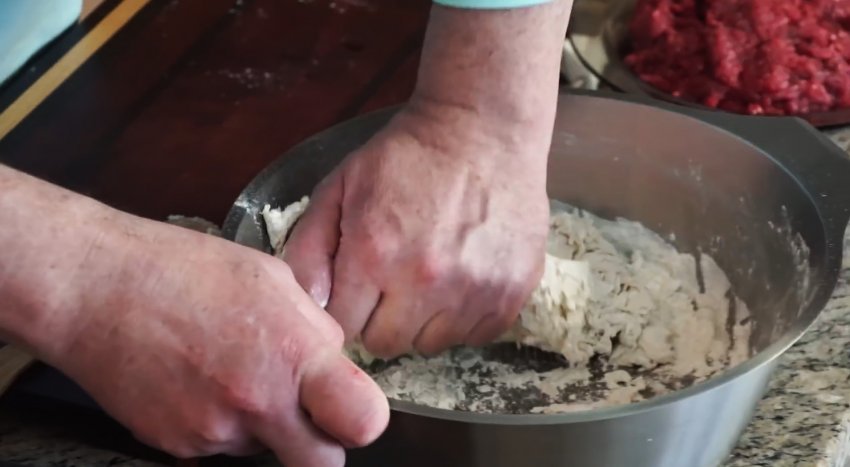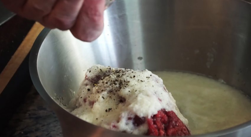 Она размешивается до однородной консистенции. Начинка должна получиться жидкой, чтобы ее можно было размазывать по тесту. Для этого в фарш добавляется вода. По мере настаивания он ее впитывает, от чего становится гуще, так что в дальнейшем может потребоваться еще подлить воды.