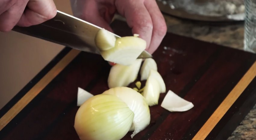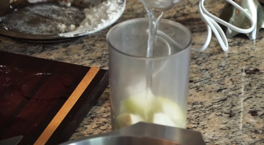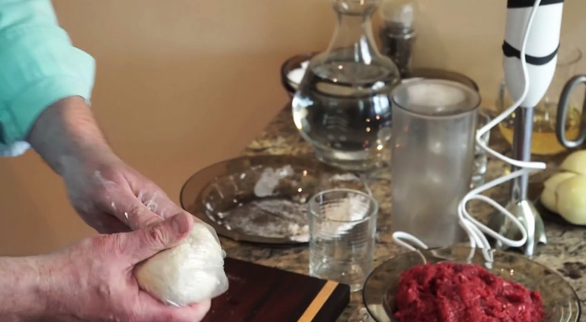 После теста можно заняться фаршем. Он может быть из говядины, баранины, свинины или любого другого мяса. Секрет вкусных чебуреков в том, чтобы фарш получился сочным. Для этого в него добавляется 2 луковицы, измельченные блендером или на терке. Можно также пропустить их на мясорубку. При измельчении блендером поможет добавление в чашу воды, тогда лук не будет налипать, и разобьется в пюре.