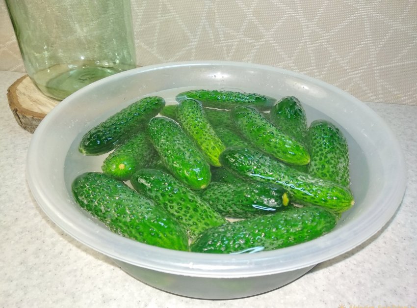 Огурцы перекладываем в миску, заливаем чистой водой на полтора-два часа. Вода должна быть прохладной. После таких действий огурчики получатся хрустящими.