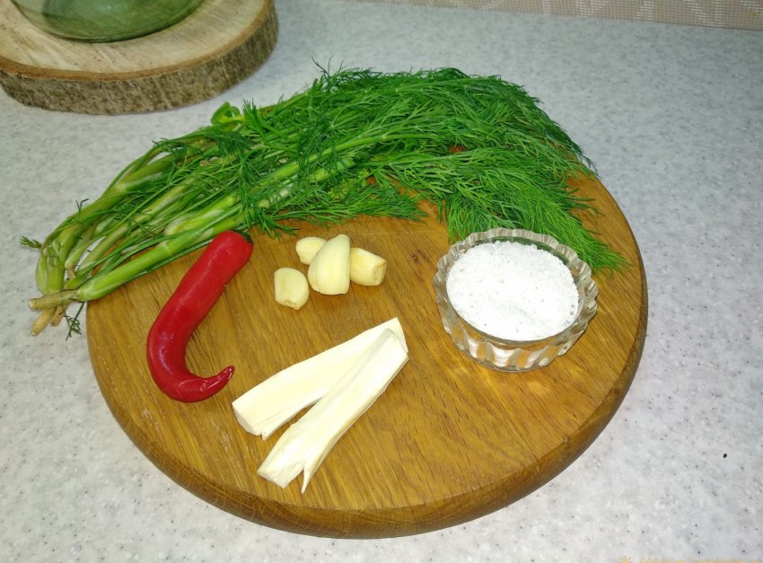 Понадобится зелень укропа, чеснок, перец горький, немного корня хрена и каменная соль.
