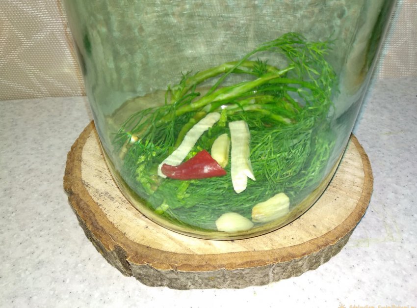 На дно банки выкладываем половину пучка укропа. Чеснок разрезаем на две-три части, половину кладём на дно банки, дополняем частью хрена и немного горького перца. Количество перца добавляем по своему вкусу.