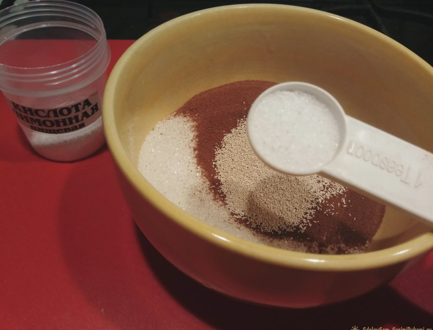 Очередность добавления ингредиентов может быть произвольной, потому что в итоге все сухие ингредиенты в емкости нужно перемешать.