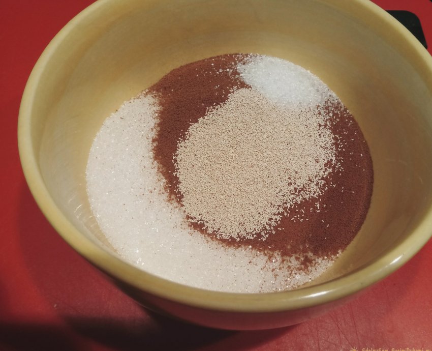 Всю смесь сухих ингредиентов пересыпать в емкость с теплой водой.