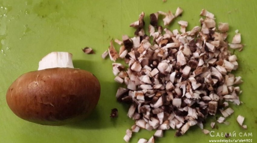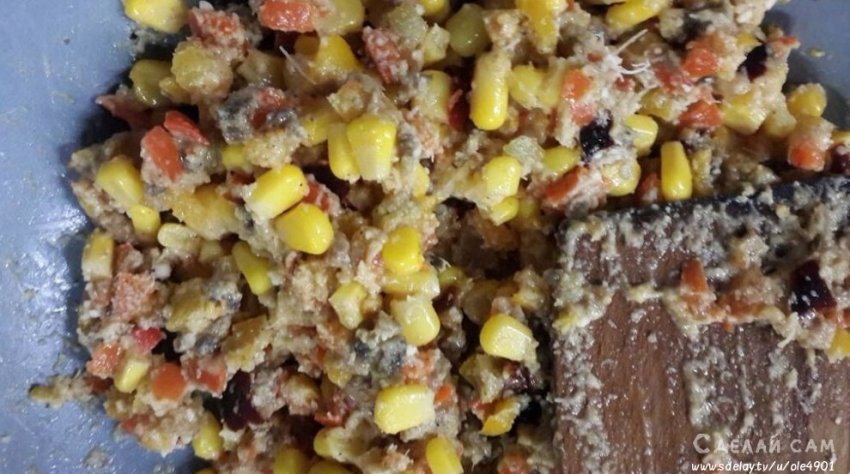Нарезаем овощи, грибы, оливки на мелкие кубики. На сковородке поджариваем нашу начинку (сначала обжариваем грибы, потом добавляем овощи, кукурузу). Далее, выключаем огонь, натираем сыр. Солим по вкусу.