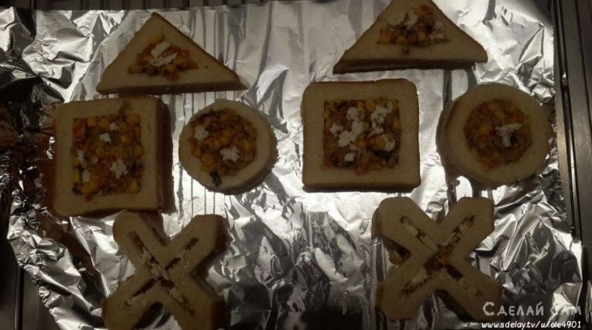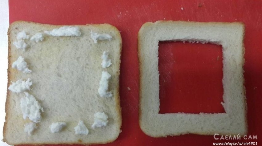 Из хлеба вырезаем геометрические фигуры оставляя место под начинку.