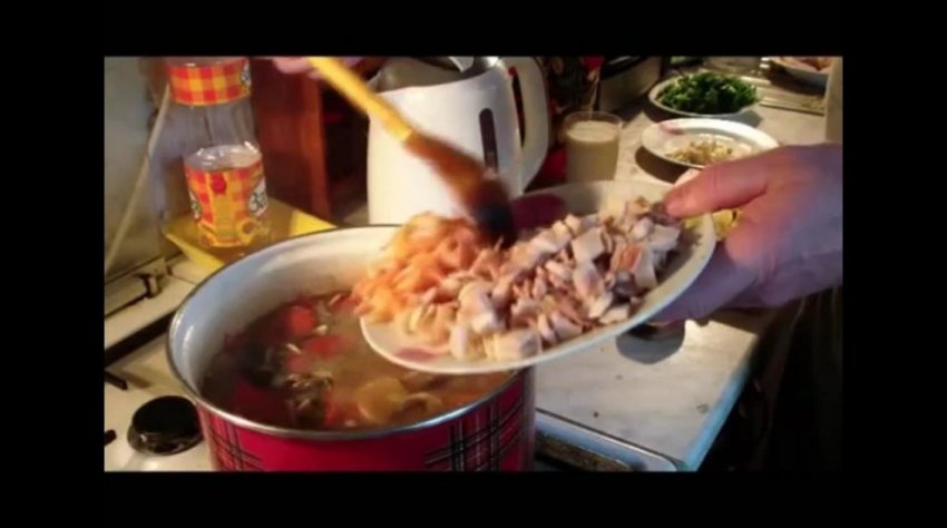 Бульон-основа - рыбный бульон, остается от отваривания креветок и кальмаров, которые временно из него вынуты, порезаны и будут добавлены позже. Шелуху от очищенных креветок можно еще в нем поварить для насыщенности.