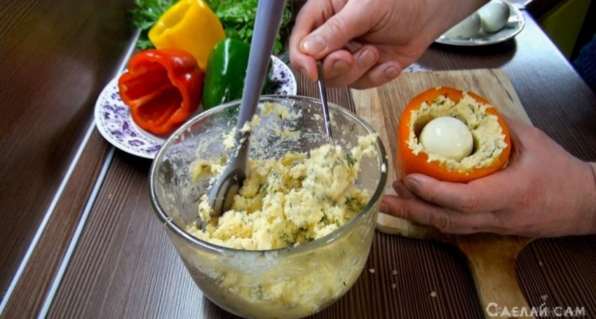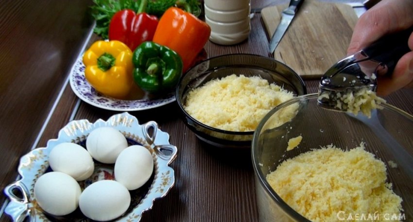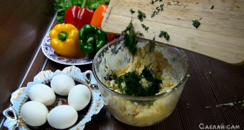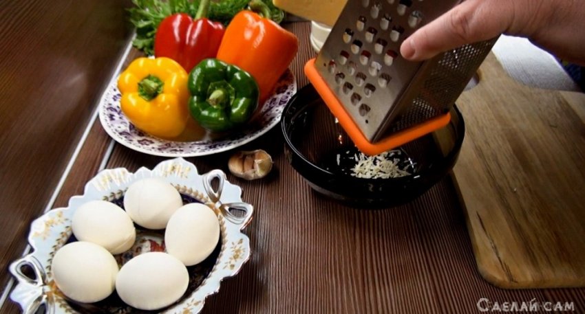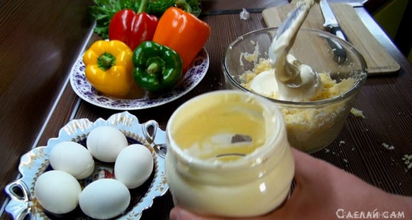 Что нужно: болгарский перец, вареные яйца, сыр, чеснок, майонез, свежая зелень.