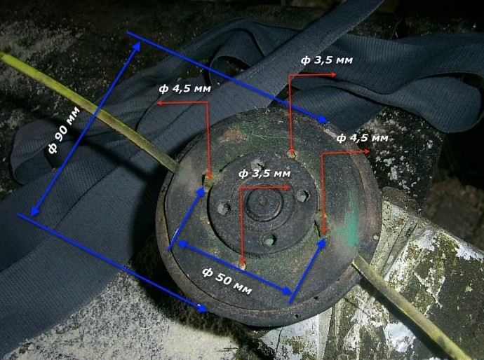 Отмечаем диаметр 50мм. на одной и сверлим отверстия как на фото .Отверстия 4,5 и 3,5 это для лески 4 и 3 диаметра .