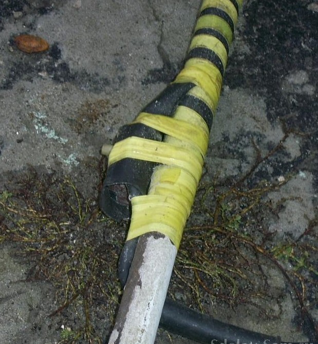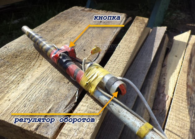 Выключатель перенёс на край корпуса, добавив 1,5м. медного провода 2,5сеч., и закрепил изолентой предварительно изолировал (вставил в камеру с велосипеда)