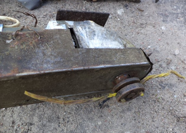 Все детали косилки собраны из подручных средств , корпус и ручка взята с отопительной 15-й трубы , крепление с болгаркой стальная пластина от 2 до 3 мм , согнута под углом 90 гр., и приварена к трубе под углом 45гр.