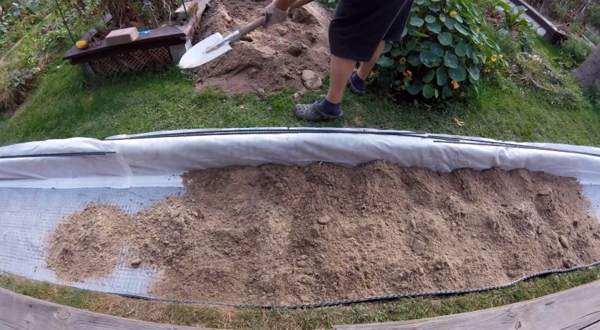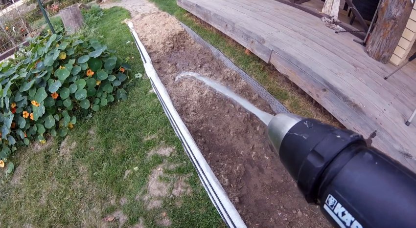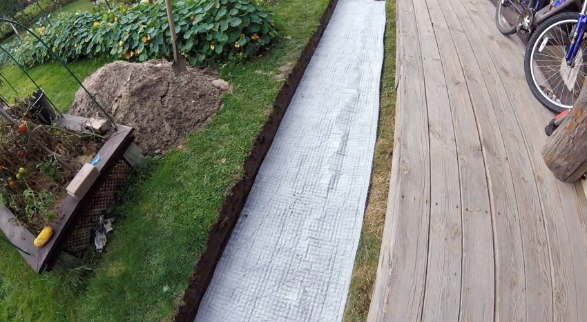 Так как траншея будет засыпаться песком, то нужно отгородить от него грунт, находящийся сбоку. Со стороны возвышения можно изначально укладывать мембрану и на бортик. Напротив, со стороны стекания воды, бортик нужно переложить геотекстилем, приклеив к мембране двусторонним скотчем.