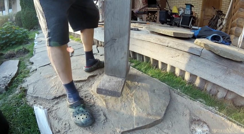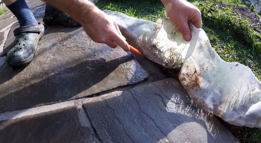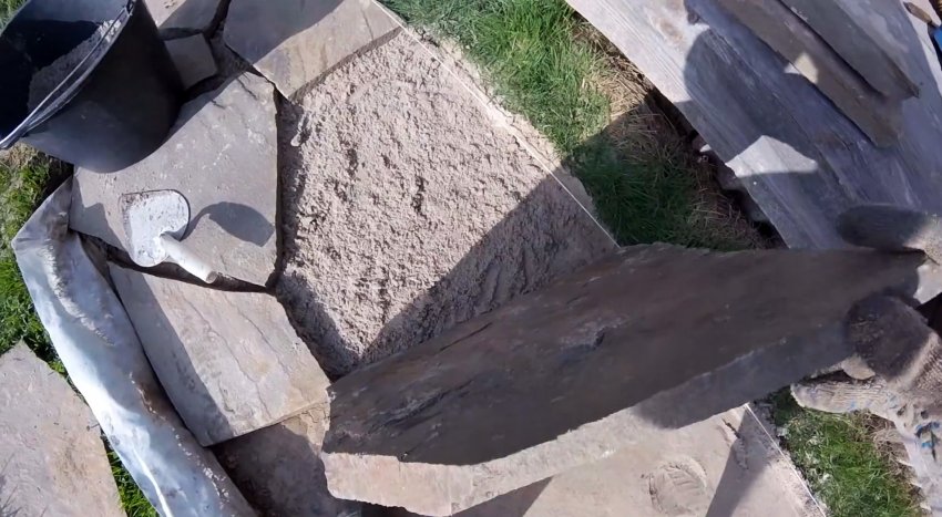 Далее подсыпаем тончайший слой песка, и на него выкладываем дикий камень.