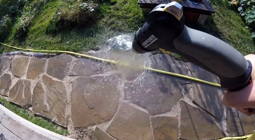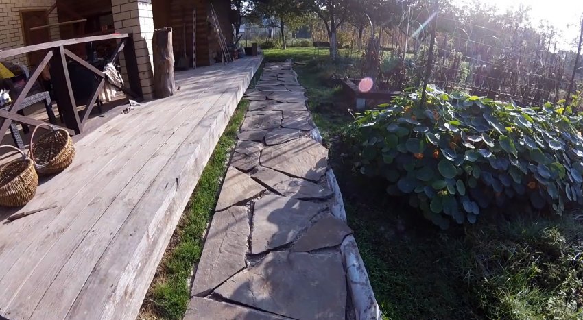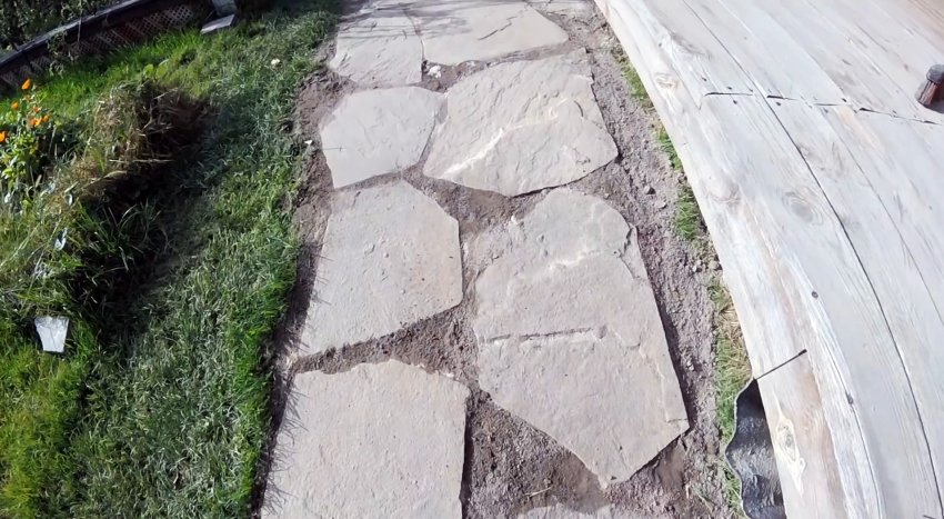 Можно уложить камень даже без подрезок болгаркой, но тогда дорожка будет иметь рваные края, что смотрится после зарастания травой очень даже достойно. Зазоры между плитками засыпаются песком, и проливаются водой, чтобы его уплотнить.