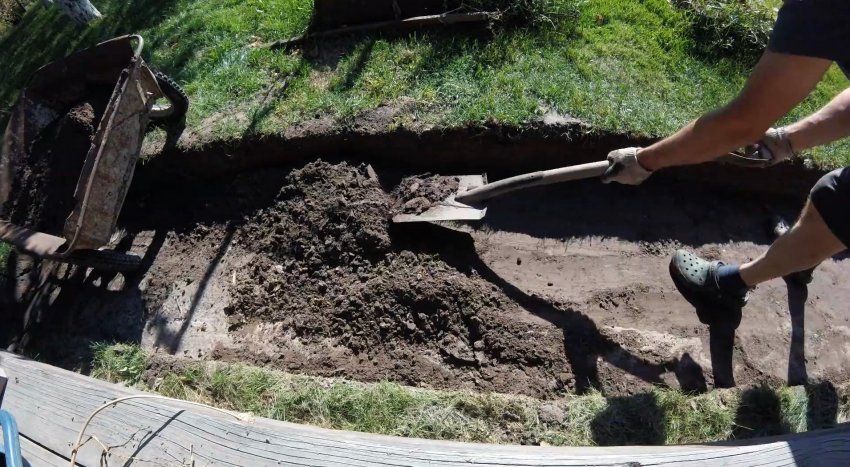 Затем прорезаем грунт лопатой по шнуру, отбивая тем самым периметр под траншею. Это позволит убрать веревку, чтобы она не мешала. Затем выбираем грунт на глубину штыка лопаты. Нужно стараться не подрывать грунт на дне траншеи, чтобы он остался плотным. Также важно сделать дно под уклоном вправо или влево для отвода осадков.