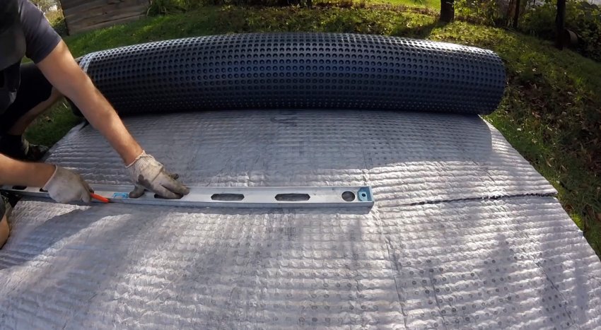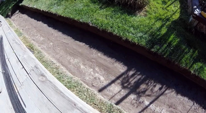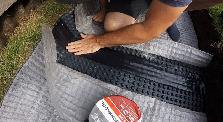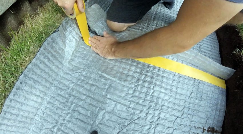 На дно траншеи укладывается профилированная мембрана. Если она широкая, то настилать можно и на бортик, но только не с той стороны, куда должна стекать вода.