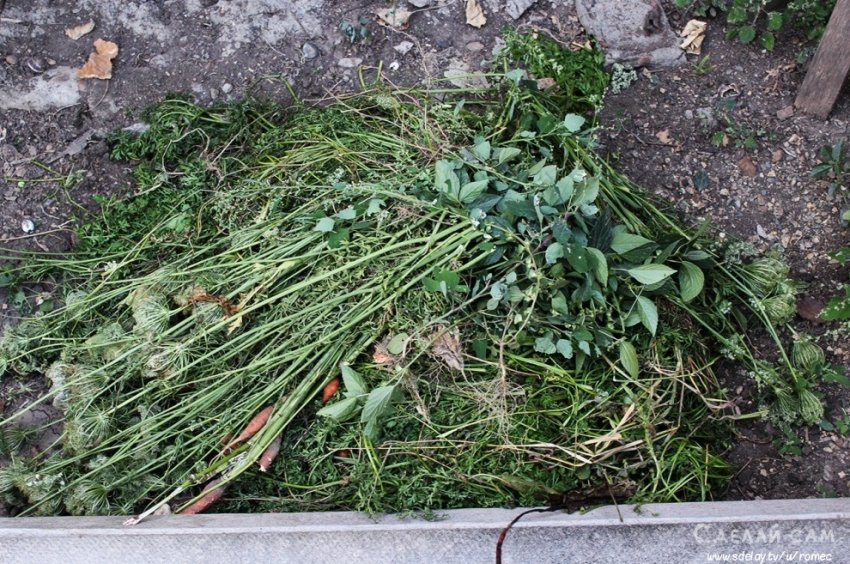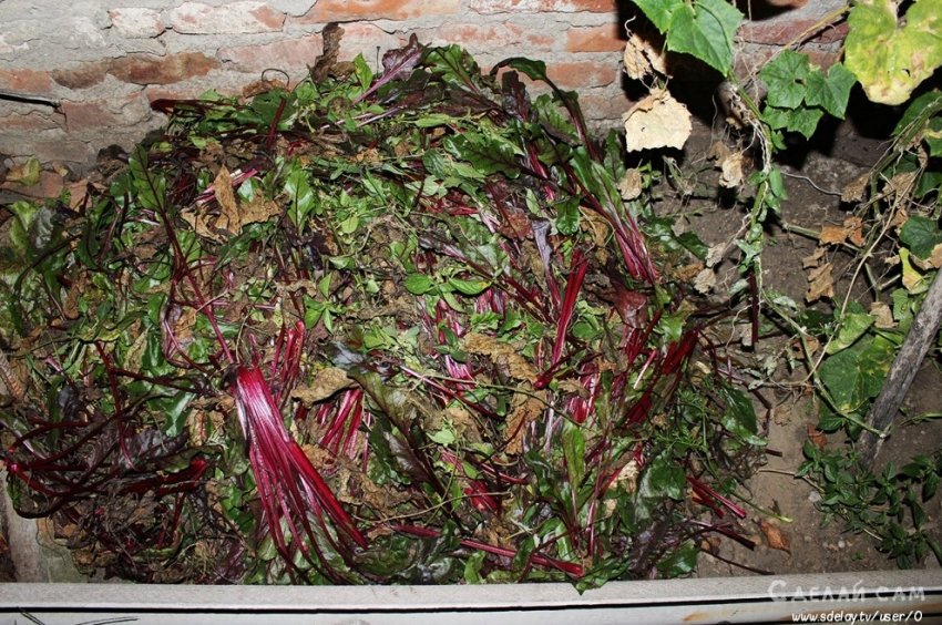 Сверху прикрываю ботвой от этой же свеклы, толщина слоя 7-10 см, если ботвы не хватает-добавляю просто траву.