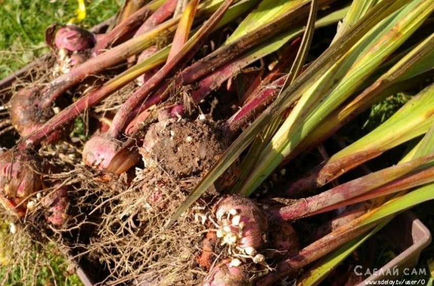 Через несколько недель после цветения поздних сортов луковицы вытягивают из земли вручную. Стебель обязательно обрезают.